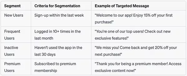 This table is an example of dividing the user base of an application. Suppose, you divide the users of your app into these four categories, now, it will provide personalization options for you to tailor messages to cater to every category.